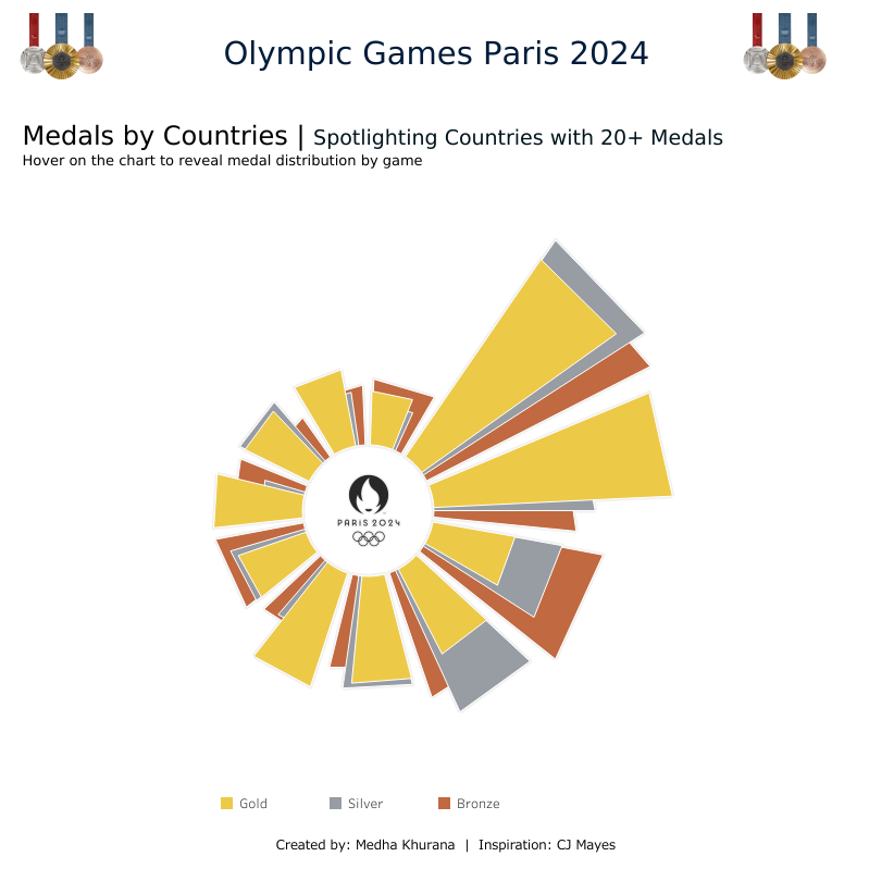 Next, I grabbed the Paris Olympic Data 2024 from Kaggle, which I wanted to analyze. The goal was to rebuild the template using the Olympic data, focusing on visualizing the number of medals won by each country, split by category, during the Paris 2024 Olympics. I also applied a filter to include only those countries that won more than 20 medals overall, ensuring the data was focused on top-performing nations.