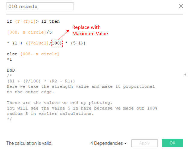 Now, the highest value in my dataset is 44 (for the US medals). Ideally, I want this maximum value to extend all the way to the edge of the outer circle. To make this happen, we need to tweak two key calculations—010. resized x and 011. resized y—by replacing 100 with the maximum value in our data.