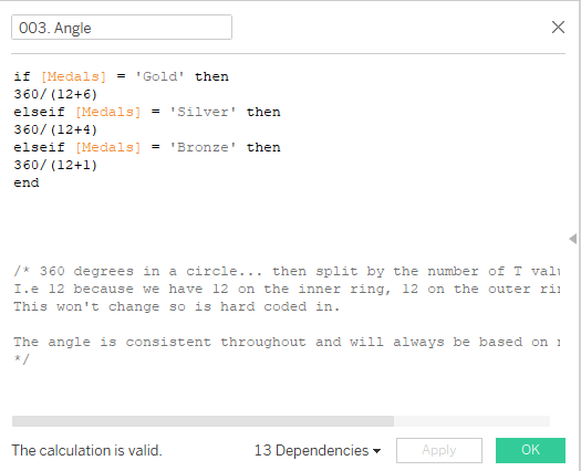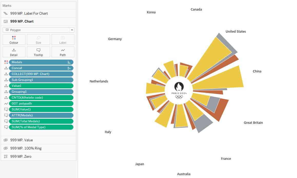 Let’s tweak these angles slightly based on the type of medal. After making this adjustment, drag 'Concat' below Medals in the Marks section.