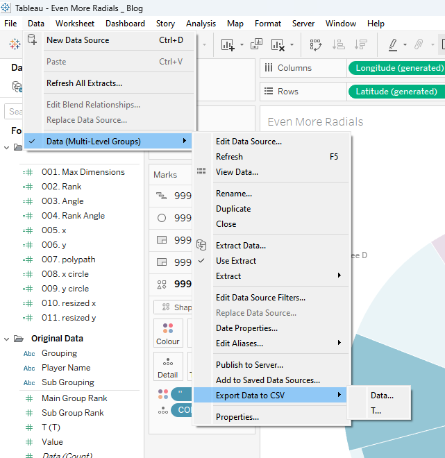 To use CJ's template, I first downloaded it from his Tableau Public page, then clicked on the data and exported the two data files as CSVs.