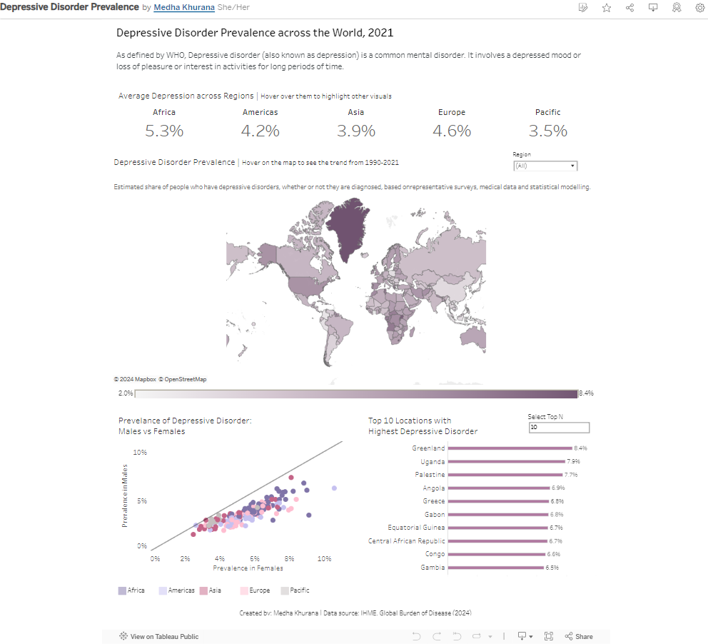 Shifting the focus to the overall analysis, I created the dashboard below to examine the prevalence of depression worldwide based on GBD data (2021).