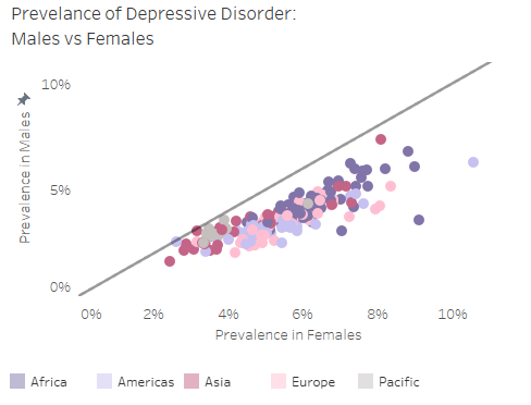 The scatterplot holds the answer. It reveals a striking trend: in every country, women experience higher rates of depression than men. This pattern highlights a significant gender gap in mental health.