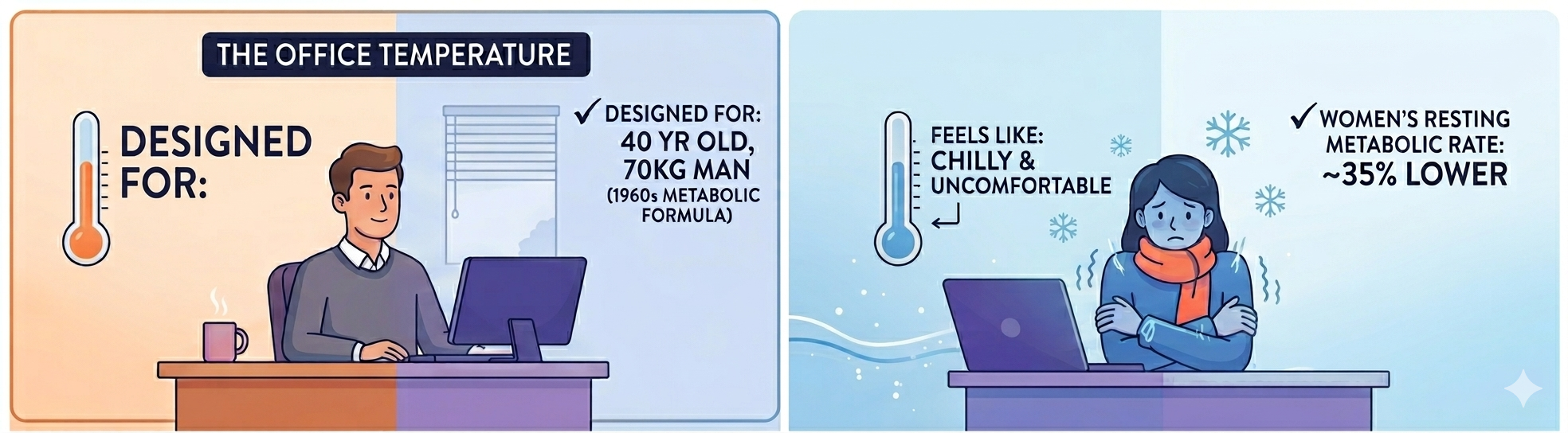 I read Invisible Women by Caroline Criado Perez a while ago, and one detail that has stayed with me ever since is the Office temperatures. The standard office temperature is set based on a metabolic rate formula developed in the 1960s, specifically for a 40 yr old, 70kg man. Women's resting metabolic rate is roughly 35% lower, which means the temperature that feels comfortable to the average man feels actively cold to the average woman.