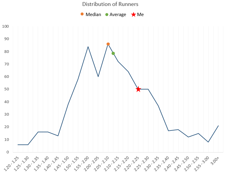 It’s fascinating to see how tightly packed the runners are around certain time windows. The average finish time in my category was 2 hours 11 minutes, and the median was just a bit faster at 2 hours 9 minutes, suggesting most runners finished around a similar window, with a few outliers taking a bit longer. This chart tells us how a few minutes here or there can shift your ranking by dozens of spots.